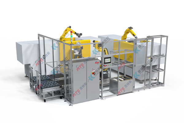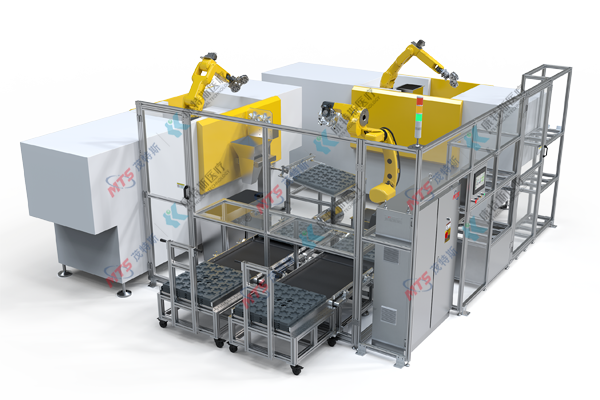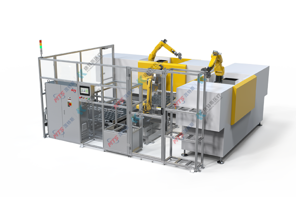 使用机械手串连公、母模注塑机,去除公母模后自动摆盘。